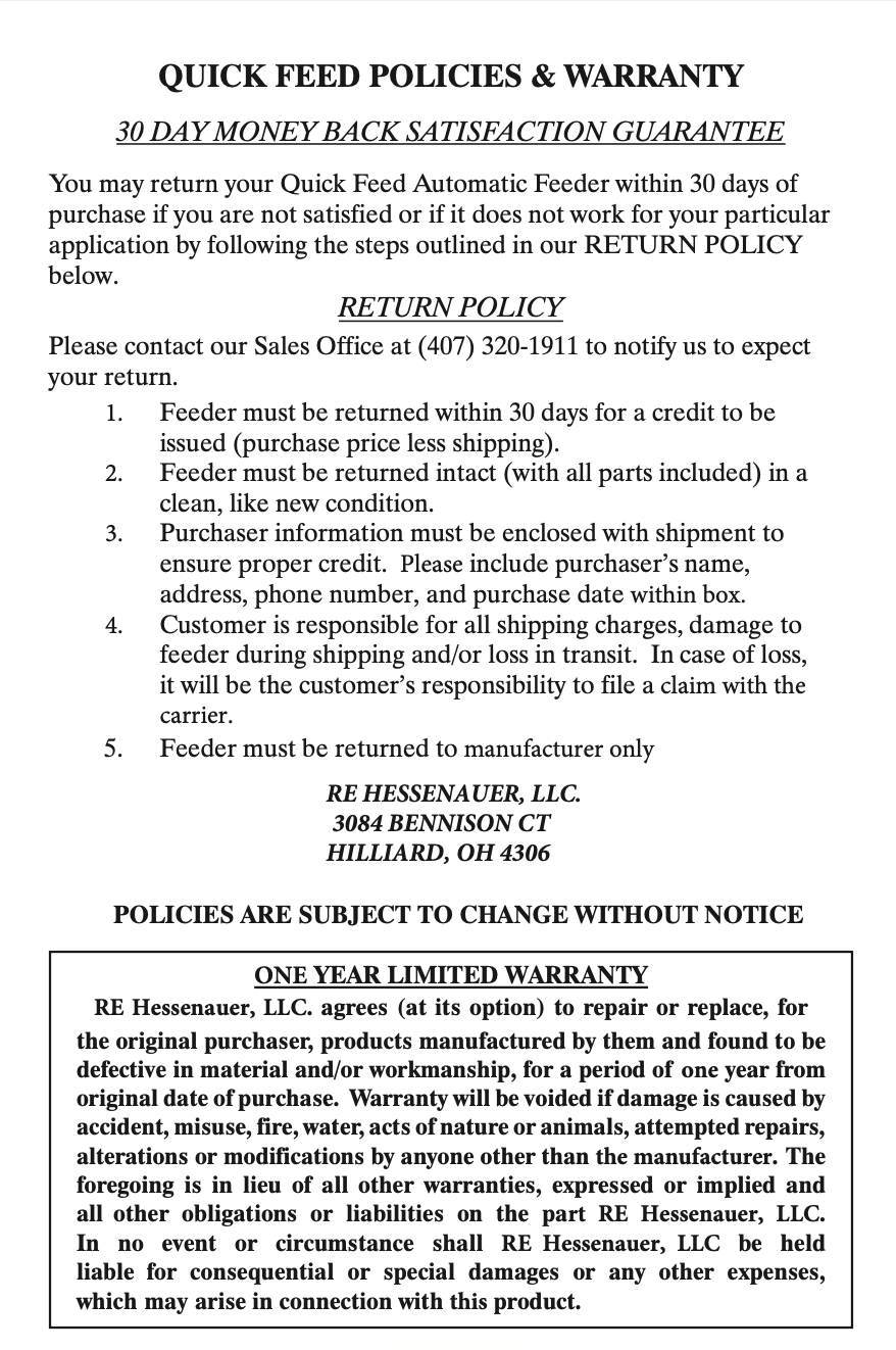We offer our 30 day money back satisfaction guarantee BECAUSE our desire is for you to be happy with our product. We are also consumers, so if our feeders don’t do the job you need, return within 30 days in like new condition and receive a full refund, less shipping charges.